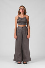 Linen Blend, Wide Leg, Fixed Waist at Front, Elasticated Side, Side Seam Pockets